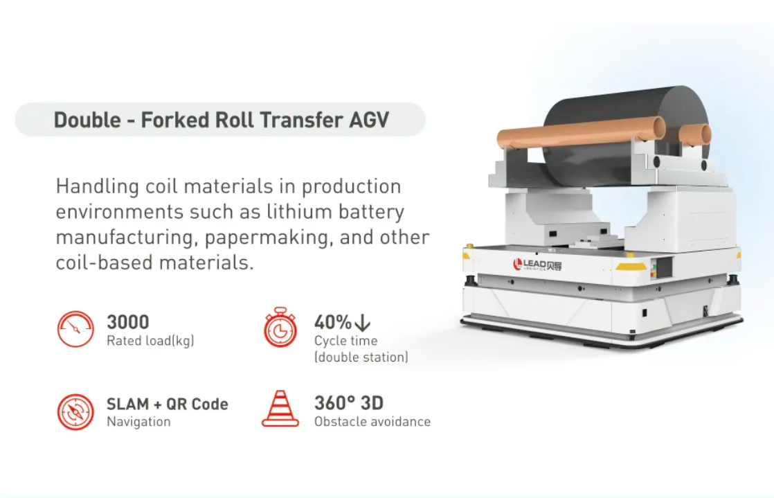 Double‐Fork Roll AGV is designed for in‑plant coil transport, moving coil material with high accuracy and speed, boosting logistics efficiency. With a 3‑ton load capacity, SLAM + QR navigation and the same omnidirectional chassis, it offers single‑ or dual‑workstation modes—the latter increasing throughput by up to 40%.