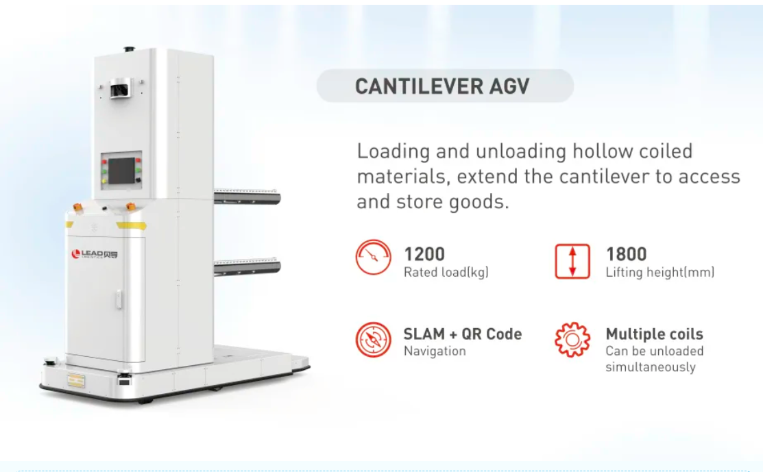 Cantilever AGV is tailored for loading and unloading hollow‐type coil materials, using an extendable cantilever arm for fast, precise operations. It combines SLAM with QR‐code navigation and an omnidirectional chassis for 360° obstacle avoidance, and can handle multiple coils simultaneously—ideal for new‐energy and general‐manufacturing sites.